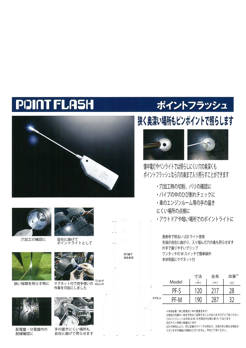 エイテックさんからポイントフラッシュが発売になりました。 似たような商品は元々ありますが先端がLEDになって明るくなったこと 細い棒の部分が曲げて保持することができること 側面にマグネットがついていて固定もできます。 デモ機も用意しておりますので、気になる方はお電話下さい。